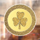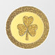 This awesome shaped window cling features a graphic image of a gold coin with two shades of gold. The outer circle has a rough texture. Inside the inner circle of the coin is a textured golden shamrock made up of 3 leaves and a stem.