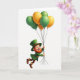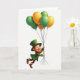This greeting card shows an anthropomorphic leprechaun floating mid-air against a bright white background, lifted by a clustered bunch of balloons ☘️. He tilts upward as if being tugged along, arms stretched high to hold a bundle of thin balloon strings that gather in his hands. His outfit is all Irish green—a tall top hat with a gold buckle and a matching coat—set off by an orange-red beard and rosy cheeks that make him look warmly amused. The leprechaun’s wide grin and shining green eyes add a flirty, friendly charm, like he’s sharing a private joke with someone just out of view 💚. Above him, the balloons alternate between emerald green and golden-orange, each one glossy with small highlights that suggest smooth, tight surfaces. Any card text sits at the top in green lettering, leaving the open white space to frame the character and keep the focus on his upward motion. The balloon cluster forms a rounded canopy above his hat, with the strings dropping straight down in a neat, slightly fanned bundle.