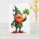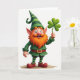 This card shows a cheerful leprechaun centered on a bright white background, drawn with rounded, almost clay-like depth. He wears an emerald-green tunic with a golden belt buckle, striped stockings, and chunky red shoes, topped with a tall, curled green hat that rises above his head. His orange beard is full and textured, and his bright blue eyes and rosy cheeks give him a friendly, inviting look, like he’s smiling at someone just off to the side. In one raised hand, he holds a green four-leaf clover ☘️, angled outward as if offering it to a close friend. The lighting is soft and even, shaping the curves of his face, hat, and clothing without harsh shadows. A short St. Patrick’s Day greeting appears near the top in green lettering, with a smaller line of text beneath it in a lighter shade, leaving the character unobstructed 💚. The hat’s curled tip arcs upward in layered greens, and the clover’s four leaves show clear veins against the white space.