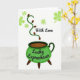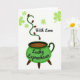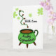 This greeting card shows an emerald green cauldron sitting low on three dark legs, like it’s just been set down for a shared secret. Inside, the brew is a deep dark brown, and a curling green vine rises from it like warm steam, dotted with small brown pods that add texture and depth. The white background stays open and bright, sprinkled with light green clovers that drift around the scene like confetti ☘️. Near the top, the words “With Love” appear in black, flowing lettering, floating above the rising vine as if spoken softly. Across the front of the cauldron, “Lucky Leprechaun” is written in black lettering that follows the curve of the pot. The mix of greens and earthy browns against the white space creates a cozy, close-to-you feeling, like a friendly hand squeeze or a sweet glance 💚. The clovers vary in size and spacing, scattered across the background around the cauldron and the upward swirl.