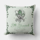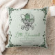 This elegant green "Lucky Little Shamrock" gender neutral baby shower throw pillow features a chic hand-drawn Irish Victorian baby carriage adorned in soft green tones and surrounded by green lucky shamrocks, all against an elegant soft green background. Printed on the front.