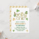 Lucky One First Birthday Party Invitation. Design features typography script ''lucky one'' in gold lettering, shamrock icons in gold and green colour, St Patrick's Day hat and bow. Personalise with party details in trendy capital lettering.c