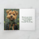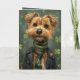 Celebrate St. Patrick’s Day with this stylish card featuring a scruffy terrier in a green plaid scarf and leather jacket, surrounded by lucky shamrocks and a rustic Irish backdrop. The warm cream-toned typography adds a timeless touch, making this card a perfect way to send good fortune and festive cheer. Inside, the heartfelt message reads: "Wherever you wander and whatever you do, may luck and laughter follow you!" A unique and charming way to wish someone a Happy St. Patrick’s Day.