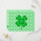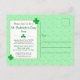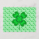 This fun St. Patrick's Day party invitation design features a whimsical background pattern of three-leaf and four-leaf shamrocks and polka dots on a pale green background, with larger shamrocks in the foreground. All the customisable party details appear in a gold-edged white area on the back of the postcard in popular typography so that you can personalise this card for your own party.