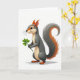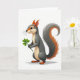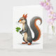 This card features a stylized squirrel standing upright on a bright white background, drawn with a smooth cartoon look and a touch of depth. Its fur is charcoal grey with fiery orange on the ears, nose, paws, and the big curling tail, while creamy beige softens the belly and inner ears. The squirrel’s wide, glossy eyes and fine whiskers give it a sweet, almost flirty expression, like it’s sharing a little secret with someone close by. In its front paws, it gently holds a four-leaf clover ☘️, and the careful grip reads like a small, affectionate offering. The clover is a rich emerald green 💚 that pops against the grey-and-orange palette, pulling your gaze right to the center. Lighting stays even and bright with very little shadow, though a faint grey shade under its feet keeps it grounded. There’s no busy scenery around it, just crisp open space that makes the squirrel’s spiky ear tips and the tail’s textured strands stand out.