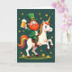 This card shows a cheerful leprechaun riding a white unicorn across a rich green field, setting a friendly, romantic-in-a-fun-way scene for St. Patrick’s Day 💚. The leprechaun wears a tall emerald hat with a gold buckle and a matching green suit, and his ginger beard frames a wide grin aimed fondly toward his magical companion. One hand lifts a foamy mug of golden ale as if to toast someone close by, while the other steadies him in the saddle. The unicorn’s blue eyes look gentle and attentive, with a spiraled golden horn catching the light above its forehead. A flowing rainbow mane and tail stream behind them like a shared parade ribbon, adding 🌈 color to the deep green background. Near the top, the greeting text sits in a light yellow tone against the darker forest-green sky, easy to spot without overpowering the artwork. Below them, small yellow four-petaled flowers dot the grass while tiny sparkles scatter around their path, glinting near the unicorn’s hooves.