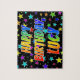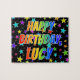 This exciting and vibrant birthday-themed jigsaw puzzle design has the message "HAPPY BIRTHDAY, LUCY" with the characters having a colourful rainbow spectrum inspired gradient pattern, along with a fun star field background pattern. An exciting puzzle like this might be used to send birthday greetings to somebody named Lucy. [~Z0000468]