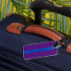 A pretty double-sided, acrylic luggage tag with a pattern of traditional ogee shapes in shades of purple and blue. The strap is in leather.