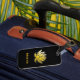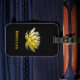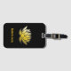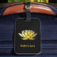 Luggage tag with an illustration of the gold lotus flower.