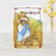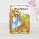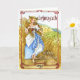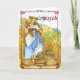 Illustration of A Maiden dressed in Renaissance garb stands in a field of wheat holding the first of the harvest of wheat and corn. A blessing for the first harvest inside the card.
