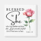 Blessed is She who has believed that the Lord would fulfil His promises to her. - Luke 1:45 Watercolor Single Rose Inspirational Bible Verse Design. Great gift for all women.