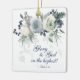 Inspirational scripture Christmas personalised ceramic ornament depicts an elegant white and navy blue rose watercolor floral design. It features a portion of Bible Verse Luke 2:14, "Glory to God in the highest!" Customised the back with name and date or the details of your choice.
