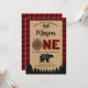 Lumberjack invite, features, red buffalo plaid, a brea, log, bold One, pine trees, and axes. Fun and cute birthday party invite for a 1st Birthday!