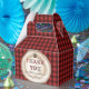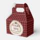 Stylish favour boxes with a red and black buffalo plaid pattern and tree stump design.