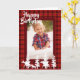 A lumberjack theme. Red flannel in a plaid pattern. Forest and wildlife silhouettes in white. Pine trees, moose and a fox with an eagle flying over the text: Happy Birthday. White letters. A dark red frame and a photo template for Your image of the birthday kid. Use a portrait size photo (vertical)