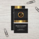 An exquisite black coloured card with three differential shades cover the front face. A gold strip with an underlying white line runs across the face of the card near the midsection. . At the top, you have your elegant faux gold logo with an abstract design of a service guard dog. It's tail and hind leg form an abstract letter P for Protection. Below the gold strip, you have your name, job title and contact details.
