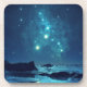 Scenic image of the icy north as seen at night. Shining stars and celestial forms can be seen twinkling overhead, glowing and luminous. They brighten the rocky terrain down below. Dark blue shadows are cast on the rocks and ice in the distance.