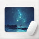 Scenic image of the icy north as seen at night. Shining stars and celestial forms can be seen twinkling overhead, glowing and luminous. They brighten the rocky terrain down below. Dark blue shadows are cast on the rocks and ice in the distance.