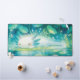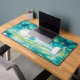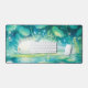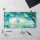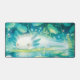 Immerse your workspace in a serene and magical glow with this enchanting luminous teal axolotl desk mat. This captivating design showcases a delightful, pearlescent white axolotl with shimmering teal gills, depicted in a charming kawaii style. The friendly creature gently rests on a vibrant green lily pad amidst an ethereal pond scene, where delicate white butterflies flutter around sparkling water droplets and lush green foliage. The prominent colors of vibrant teal and refreshing emerald green, complemented by soft whites and subtle blues, evoke a dreamlike aquatic wonderland. This whimsical illustration brings a peaceful, happy, and fantastical ambiance to any desk, making it a perfect accent for those who love cute sea creatures and mystical nature scenes. This desk mat offers versatile use for various other businesses, events, or situations.