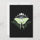 A vibrant green luna moth is surrounded by moon phases and lush green leaves against a deep black background.