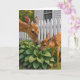 A doe and her fawn stand near a white picket fence, gently nuzzling the lush green leaves of a hosta plant.