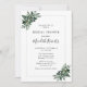 A lush greenery arrangement of emerald and dusty green leaves, ferns, and eucalyptus draws attention to the text on our beautiful bridal shower invitation. The back of the card is a dusty green shade found in the bouquet's foliage. All example text can be easily revised with your own details on the personalisation template.