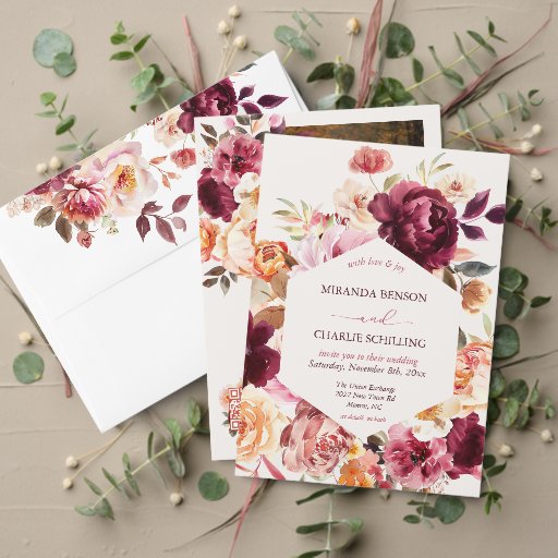 Embrace the rich beauty of autumn with the "Lush Fall Florals" wedding invitation suite. This stunning design features opulent double roses in warm burgundy, soft peach, and delicate pale pink, surrounded by elegant fall foliage that captures the essence of the season.