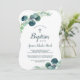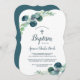 This lush greenery and eucalyptus with cross baptism invitation is perfect for an elegant backyard event. The modern botanical design features gorgeous watercolor blue eucalyptus and green leaves.