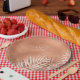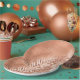 A trendy colour palette in shades of terra cotta, copper and rust; sparkling geometric frames and elegant design layouts, provide the basis for this exciting wedding suite. Whether you're planning a destination wedding or staying close to home, this delicate palm leaf design set makes an eye-catching choice. The coordinating paper plate shown here provides a template to easily add your initials, names and wedding date. Search ID956 to see other pieces and colour choices for this set.