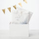 A trendy colour palette in shades from steel grey to windsor blue; sparkling geometric frames and elegant design layouts, provide the basis for this exciting wedding suite. Whether you're planning a destination wedding or staying close to home, this delicate palm leaf design set makes an eye-catching choice. The coordinating favour bag shown here on a white background, provides a template to easily add a 'thank you' message, your initials, names and wedding date. Search ID956 to see other pieces and colour choices for this set.