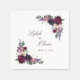 Watercolor flowers in shades of rich burgundy, gentle lilac, deep eggplant purple and pinkish orchid pair with modern green botanicals such as ferns and eucalyptus in these romantic, elegant wedding napkins.