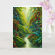 Illustration of a colourful and lush tropical rainforest with a stream, red flowers and multicolor ferns and trees.