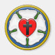 The Luther Rose's symbolism dates back to the 1520s. Luther explained that the red heart with the black cross represents the righteous living by faith in Christ the Crucified. The heart rests on a white rose, symbolising joy, comfort, and peace found through faith. The choice of white reflects the colour of heavenly spirits and angels. The white rose is set against a blue field, representing heaven, to signify that earthly joy and faith are just the beginning of eternal heavenly joy. Surrounding the blue field is a gold ring, symbolising the endless and precious happiness of heaven.