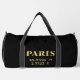 Lux look travel duffel bag features Paris, France latitude and longitude map coordinates in gold text on black background.