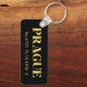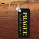 Lux metal keychain features Prague, Czech Republic latitude and longitude map coordinates in gold fonts on black background.