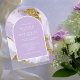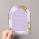 This custom design featuring an alcohol ink abstract in shades from soft lavender to lilac purple with glittering gold accents, is perfect for a romantic and elegant wedding theme. The arch-shaped transparent acrylic wedding invitation shown here provides a template to easily add your own names, wedding date and event details. Search ID990 to see other pieces in this coordinated wedding set.