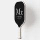 This elegant, minimalist pickleball paddle for the mister says "Mr." in a white, modern, high-fashion luxury font on black, and also has a spot for your last name and wedding date. You can change the background colour to anything you prefer.
