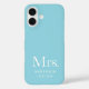 This elegant, minimalist phone case says "Mrs." in a white, modern, high-fashion luxury font on robin egg blue, and also has a spot for your last name and wedding date.