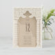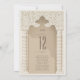 Set a regal tone at your wedding reception with this luxurious table number card, inspired by the intricate artistry of Arabesque design. The card showcases an elaborate ivory arch with swirling patterns reminiscent of traditional Middle Eastern art, set against a rich taupe canvas. The main attraction, a grand table number, is displayed in a deep espresso font that is both bold and elegant. Flanking the arch are two classic columns adorned with a herringbone pattern in shades of ivory and beige, offering a subtle contrast to the smooth taupe background. This card not only serves as a practical guide for your guests but also as a piece of art that enriches the table setting with its cultural beauty and neutral colour scheme.