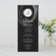 This modern menu features your family initial inside an artistic silver ring surrounded by light grey wispy brush strokes overlaid on a midnight black background. A great choice for your urban wedding. Add your menu details by clicking the customise link. This is part of a collection with matching napkins, table number cards and other wedding essentials.