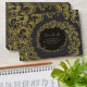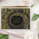 This design is created with a rich, dark background that beautifully enhances the ornate golden damask patterns flowing across the surface. The centerpiece features an intricate circular floral damask frame in radiant gold, enclosing the personalised text. The shimmering gold detailing against the deep black gives it a regal and luxurious appearance.
