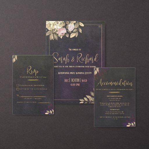 Elevate your wedding with this luxurious black velvet botanical invitation, beautifully textured to mimic rich velvet and crowned with gold foil accents. Featuring blush peonies, muted gold foliage, and an ornate gold border, this design blends timeless elegance with a touch of gothic glamour—perfect for evening, black-tie, or formal celebrations. The velvet-like backdrop adds depth, while the gold foil script ensures your details shine. Completely customisable and available as an entire matching suite to create a coordinated and polished wedding aesthetic.
