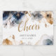 Design features a cascade of blooming watercolor navy blue roses with watercolor golden washes with handwritten text cheers.