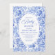 Create a timeless first impression with this baby shower invitation featuring elegant French toile de jouy roses in refined shades of navy blue, royal blue, dusty blue, and deep blue, inspired by classic chinoiserie floral design. This sophisticated style blends heritage elegance with modern charm, making it perfect for a memorable baby shower celebration.