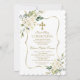 Elegant card design featuring watercolour delicate white flowers and green leaves, a faux gold cross and frame, floral divider, on a white background. On the back white flowers bouquet. Use Personalise tool to add your info, change fonts, font's colours. For matching items, please, visit my Holy Communion Collection.