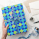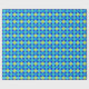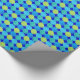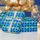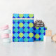 A roll of luxurious Wrapping Paper, with a grid pattern of circles in turquoise and neon green on a bright blue background. Part of the Posh & Painterly 'Blue Moons' collection; from a handpainted paper collage design by Judy Adamson.