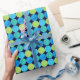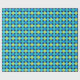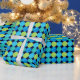 A roll of luxurious Wrapping Paper, with a grid pattern of circles in turquoise and neon green on a black background. Part of the Posh & Painterly 'Blue Moons' collection; from a handpainted paper collage design by Judy Adamson.