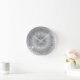 Elegant stylish round clock design featuring a shiny silver metallic filigree floral mandala on a sliver background.