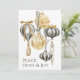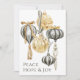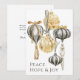 This elegant holiday card has an array of luxury gilded Christmas ornaments in metallic shades of gold, pewter, and off-white. Tassels and velvet ribbons adorn the ornaments in lovely style with a retro vintage look of beautiful glass ornaments of Christmas past. The uplifting message of peace, hope and joy adds a timely message to the card. The text template may be editing with your own wording if desired, or you may order the card with the text as shown.