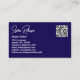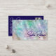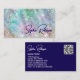 A business card with a pretty holographic glitter design featuring blue text on the front. The back features a blue background with white text.